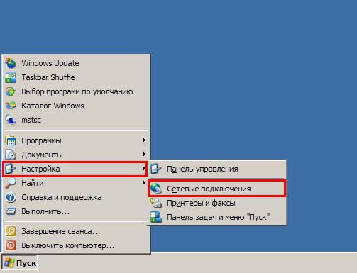 2. На панели задач нажмите кнопку "Пуск", в открывшемся меню нажмите "Настройка", в открывшемся справа меню нажмите "Сетевые подключения".