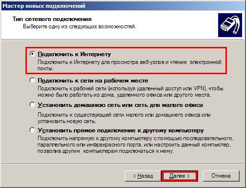 5. Оставляем переключатель на пункте "Подключить к Интернету", нажмите "Далее".