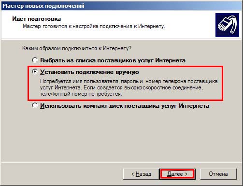 6. Поставьте переключатель на пункт "Установить подключение вручную", нажмите "Далее".