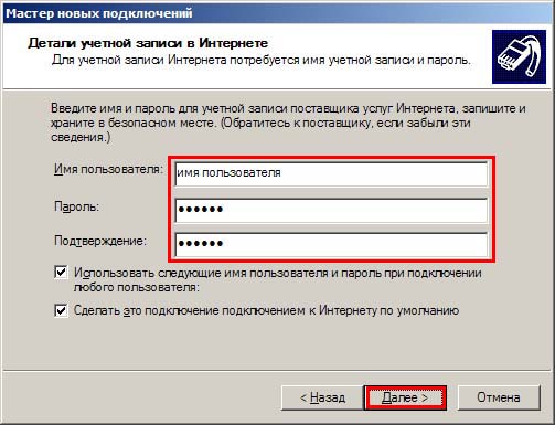 9. В поля "Имя пользователя" и "Пароль" вводите имя и два раза пароль для входа в Интернет cогласно договору, нажмите "Далее".