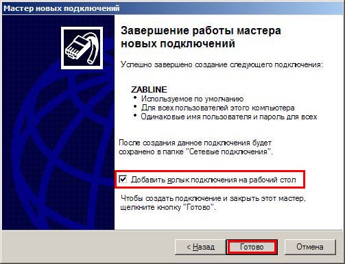 10. Установите пункт "Добавить ярлык подключения на рабочий стол", нажмите "Готово".