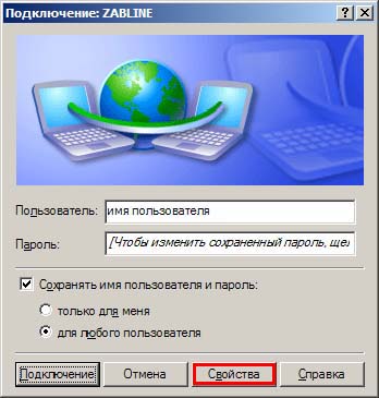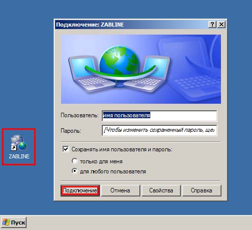 14. На этом настройка завершена. В дальнейшем для подключения к сети Интернет Вам нужно на рабочем столе двойным щелчком мыши щелкнуть по ссылке "ZABLINE", в открывшемся окошке нажать "Подключение".