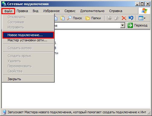 3. В открывшемся окне в главном меню нажмите "Файл", в открывшемся меню нажмите "Новое подключение...".