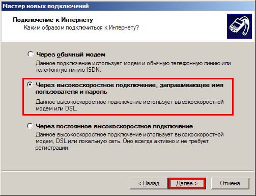 7. Поставьте переключатель на пункт "Через высокоскоростное соединение, запрашивающее имя пользователя и пароль", нажмите "Далее".