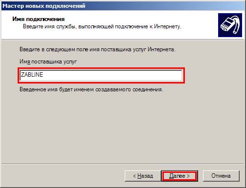 8. В поле "Имя поставщика услуг" введите название создаваемого соединения, например "ZABLINE", нажмите "Далее".