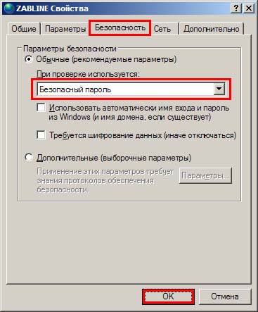 12. Выберите вкладку "Безопасность", в выпадаюшем списке параметров "При проверке используется:" поменяйте "Небезапасный пароль" на "Безапасный пароль", нажмите "ОК".